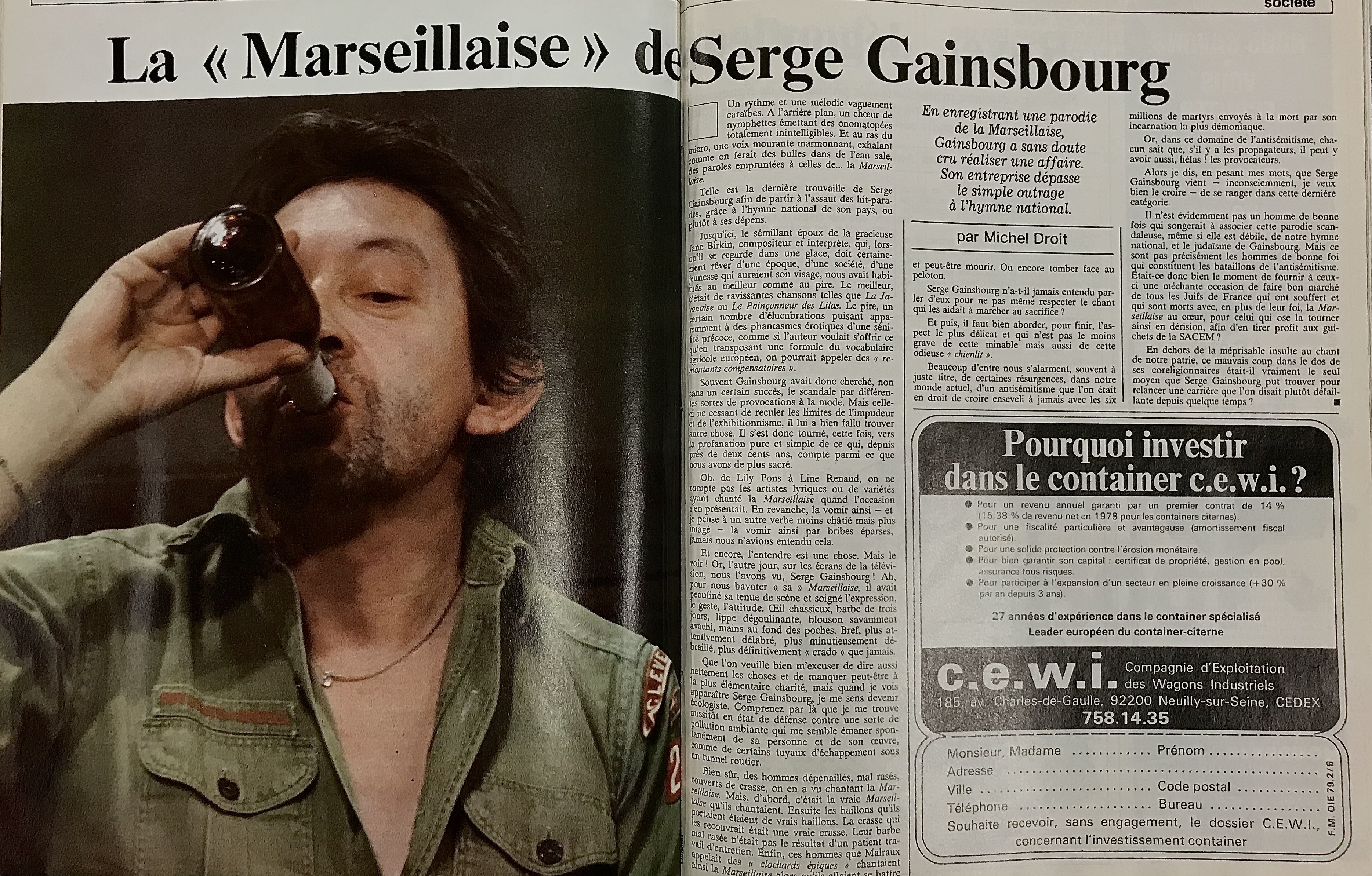 Se concluant par un commentaire selon lequel l’auteur d’« Aux armes » provoquerait l’antisémitisme, l’article de Droit entraine maintes réactions clivées dans les semaines suivantes. La section « Courrier » du Figaro Magazine du 16 juin, toute consacrée à « La querelle Droit-Gainsbourg », montre bien la diversité des avis (Alexandre, 1979: 66-67)4. À la défense de Gainsbourg, G. de Maussion soutient que Droit porte « un jugement de “vieux” sur un homme qui chante pour les hommes » (66), Aimée Alexandre fait valoir que les antisémites n’avaient nul besoin d’un bouc émissaire pour « rester ce qu’ils sont » (67), et Jacques Fontanel souligne « le caractère raciste et belliqueux » de La Marseillaise, citant le vers « Qu’un sang impur abreuve nos sillons » (67). D’autres se rallient à Droit, sans forcément soulever la question du judaïsme. Toujours dans Le Figaro Magazine du 16 juin, Philippe Crèvecoeur, de Bruxelles, se déclare « outré » par « Aux armes », et Paul Herzog, plus mordant, décrit la pièce comme un « crachat sur notre hymne national qui, parait-il, rapporte beaucoup d’argent à son auteur » (66).
