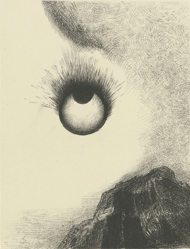 Migy ne cesse d’affirmer que le sens de leur symbiose est purement adaptatif : « Écoute nous devons collaborer bien que nous soyons d’espèces différentes, et ceci doit commencer par un respect mutuel malgré nos natures divergentes. Si nous ne mettons pas de côté nos idées propres, cela ira de conflits en conflits. Regardons plutôt ce que nous avons en commun, ce qui pour le moment présent tient en un seul mot : survivre. D’accord? » (VII: 117). Mais la saga s’évertue à suivre l’évolution vers une forme de symbiose empathique, qui tient à la fois de l’amitié (on pourrait même y voir un certain écho du couple archétypal formé par Don Quichotte et Sancho) et de la formation du Soi par une harmonisation de ses diverses instances (le parasite reprenant le rôle des symboles thériomorphes archétypaux). De l’égoïsme pur (directement mis en rapport dans l’œuvre avec la théorie du « gène égoïste » de Richard Dawkins, pilier de la Nouvelle Synthèse Darwinienne [2006 [1976]]), Migy en vient au plus extrême sacrifice, au prix même de sa vie, lors du combat final avec le parasite surhumain Goto (IX: 226-228) : obligés de se diviser pour tenter de décapiter leur formidable adversaire, Migy et Shin’Ichi échouent puisque la tête reste attachée par un lambeau de chair, ce qui lui permet de poursuivre le combat le plus long de la saga — presqu’une centaine de pages —, enchaînant toute une série de mutilations gore. Migy va alors faire diversion pour que son hôte humain puisse s’enfuir : « Nous ne mourrons pas tous les deux. Va-t-en! Adieu Shin’Ichi. Nous ne nous reverrons sans doute jamais. Je suis content que nous nous soyons rencontrés… de ne pas t’avoir pris ton cerveau… et que nous soyons devenus amis. Je prends lentement conscience. Quelle étrange sensation de sommeil. Je me sens seul. Qu’est-ce que je me sens seul… C’est donc ça… la mort… » (IX: 234-235). Le « splash panel » figure cette plongée de la conscience du parasite dans les ténèbres, dévoilant par là même une de ses sources iconographiques les plus profondes : le cycle de gravures dévolues à l’œil fantastique par Odilon Redon (avec notamment Les origines de 1883), emblème du symbolisme décadent qui marqua tant le premier mouvement ero guro.