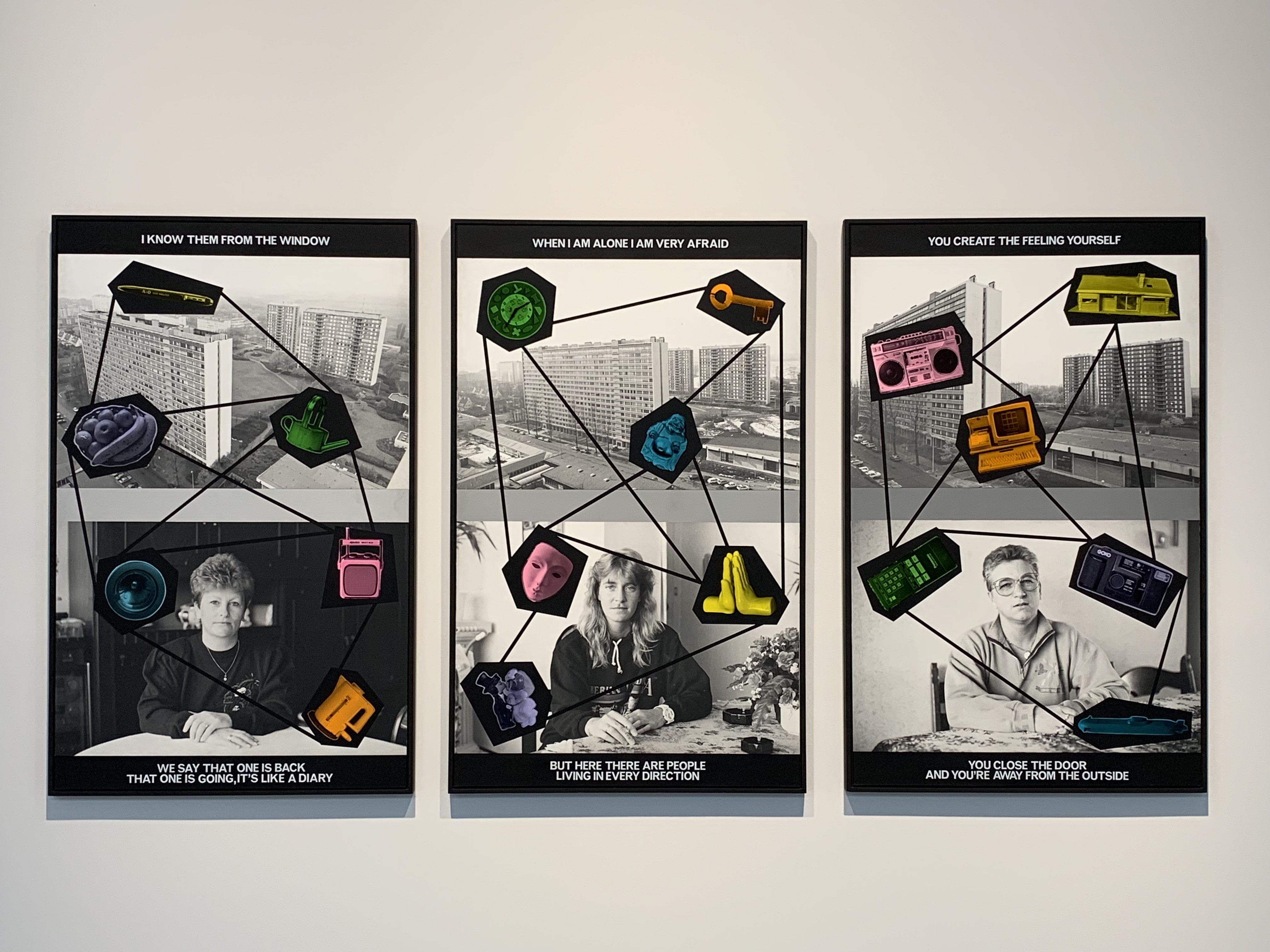 Cette non-linéarité se rejoue sur plusieurs plans de l’exposition, pouvant subrepticement renvoyer à une formule clé insérée dans Amberes, qui donne d’ailleurs son titre au quarante-septième fragment de l’œuvre : « No hay reglas » (Bolaño, 2002: 102), il n’y a pas de règles. Rien de narratif à l’échelle du parcours proposé, pas plus que dans les relations établies entre les pièces sélectionnées. Marquée par la disjonction et le pluriel, échappant à toute trajectoire uniforme, l’exposition parait régie par la logique de la ligne brisée qui sous-tend le récit de Bolaño8. Elle peut dès lors être assimilée à un « jardin aux sentiers qui bifurquent », pour reprendre le titre d’une nouvelle de Borges (1941), autre figure culte de la littérature sud-américaine à laquelle est souvent associé Bolaño. Au demeurant, nombre d’œuvres choisies reposent elles-mêmes sur le principe de la fragmentation. Ainsi de Concrete Window (1991) de Stephen Willats, qui présente trois panneaux sur lesquels figurent un portrait photographique surmonté d’une vue d’immeuble d’un quartier anversois, ainsi que des objets choisis dans leur environnement par les trois femmes portraiturées, reliés entre eux par des lignes droites formant un réseau tenu pour représentatif de leur « monde symbolique » (M HKA, 2019: 63 [notre traduction9]).