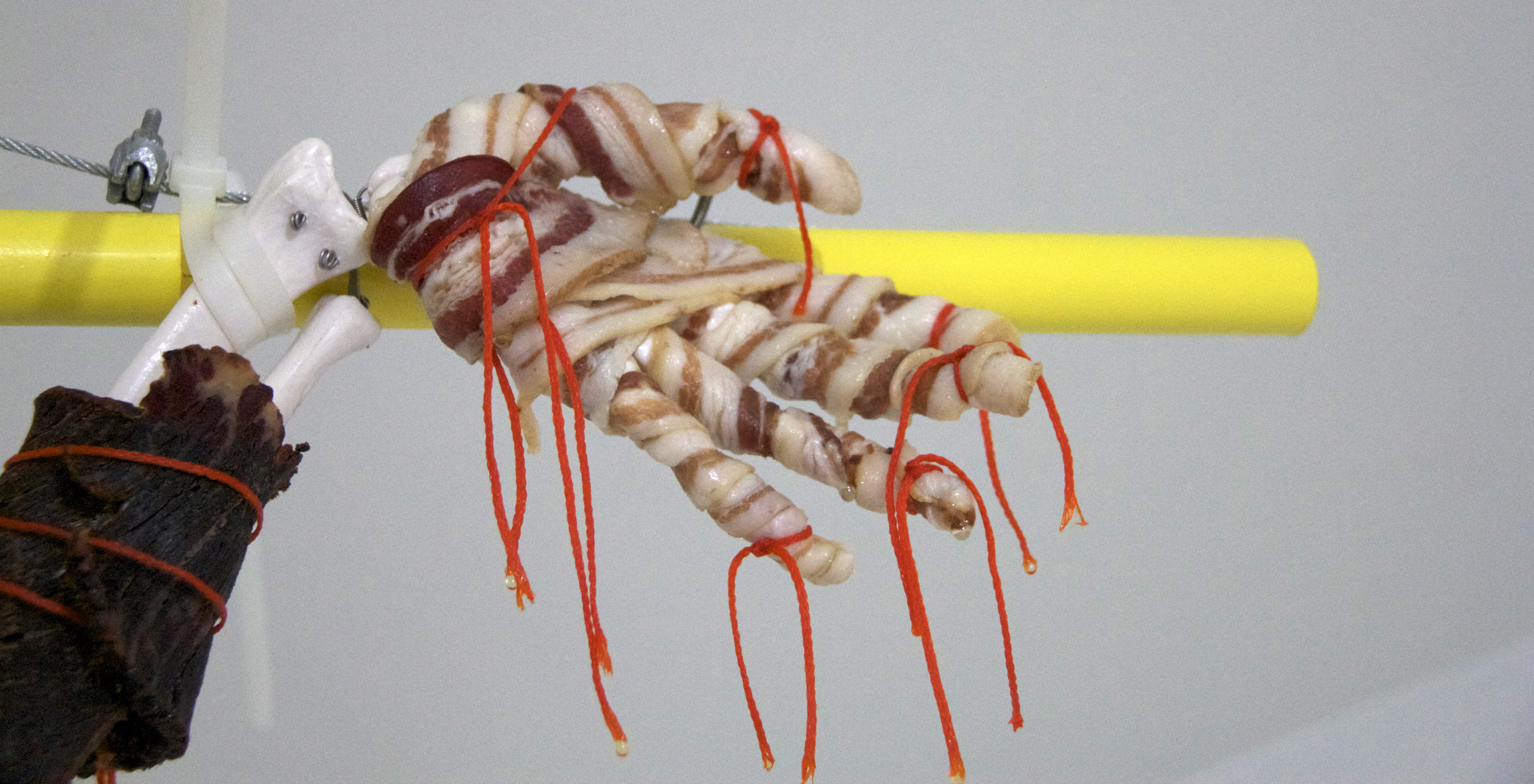Matériaux : mélamine, viandes fumées (bœuf et porc), squelette de plastique, vinaigre, etc.