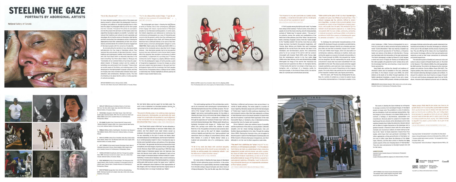 La deuxième brochure, Steeling the Gaze. Portraits by Aboriginal Artists  (ou, en français, Regards d’acier. Portraits par des artistes autochtones), fut publiée suite à l’exposition du même nom présentée au Musée des beaux-arts du Canada (MBAC) en 2008-2009. L’exposition avait par la suite voyagé à travers le Canada jusqu’en 2013. Fruit d’une collaboration entre Andrea Kunard, Conservatrice associée au Musée canadien de la photographie contemporaine (MCPC) de l’époque, et Steven Loft (Mohawk-juif), premier conservateur en résidence du Département d’art indigène nouvellement institué au MBAC, l’exposition mettait en valeur les collections des deux musées à travers quarante-six œuvres photographiques et cinq œuvres vidéo par douze artistes autochtones3. Centrée autour du portrait photographique, les œuvres présentées revisitaient l’histoire de ce genre pictural par rapport aux représentations historiques des peuples autochtones en Amérique du Nord, et plus particulièrement au Canada. La brochure de cette exposition laisse elle aussi une place non négligeable aux reproductions des œuvres, malgré l’importance du texte, qui occupe un petit peu plus de la moitié des dix pages de format carré, imprimées en couleur4.