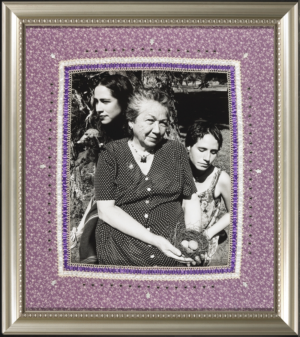 On retrouve, dans la brochure Steeling the Gaze (2009), l’expression de ce même intérêt pour la mise en valeur de la transmission des valeurs sociales, culturelles et familiales de génération en génération. L’œuvre de Shelley Niro (Mohawk) Time Travel Through Us (1999) présente trois femmes d’âge différent, la mère et les deux filles de la photographe, serrées les unes contre les autres. La photographie, en noir et blanc, est entourée d’un cadre en bois argenté et de perlage blanc entouré de tissus couleur rose, blanc et pourpre, rappelant l’esthétique iroquoise. Au centre de l’image, la mère de la photographe tient un nid d’oiseau qui contient trois œufs, faisant écho non seulement au nombre de personnes sur le cliché mais également au nombre de générations présentes lors de la prise de vue. La fille de la photographe située derrière l’épaule gauche de l’aînée tient dans ses mains une tortue que l’on devine être un clin d’oeil au clan de la Tortue, auquel appartient la photographe. On peut également y voir un renvoi à l’Île de la Grande Tortue, expression notamment employée par les nations iroquoises pour qualifier l’Amérique du Nord. Cette photographie nous invite ainsi à considérer l’importance de la communauté et de la famille dans la construction de l’identité individuelle. Pour Taiaiake Alfred, c’est la situation d’un individu au sein d’une communauté qui fait de lui un « autochtone » :