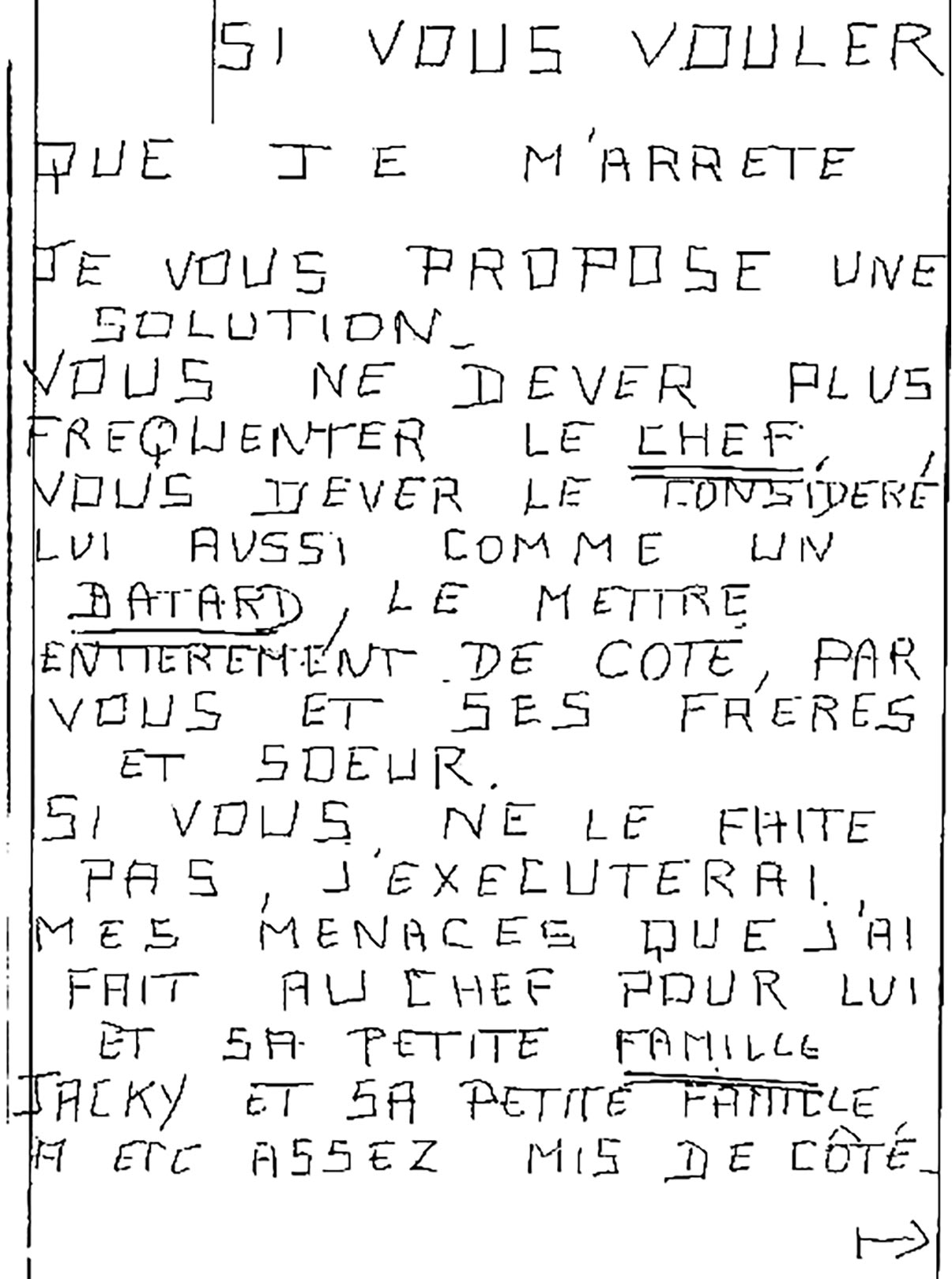 Je n’arrive pas à dormir. J’ai un cafard énorme. Je ne peux pas croire que la police m’accuse du meurtre de notre enfant. Tu sais à quel point je l’adorais. Ce qu’ils me font subir en m’accusant me fait terriblement mal. J’ai beau lutter, je sens mes forces et mon moral me quitter. Pourquoi devons-nous vivre cette épreuve? (Villemin, 1994: 137.)