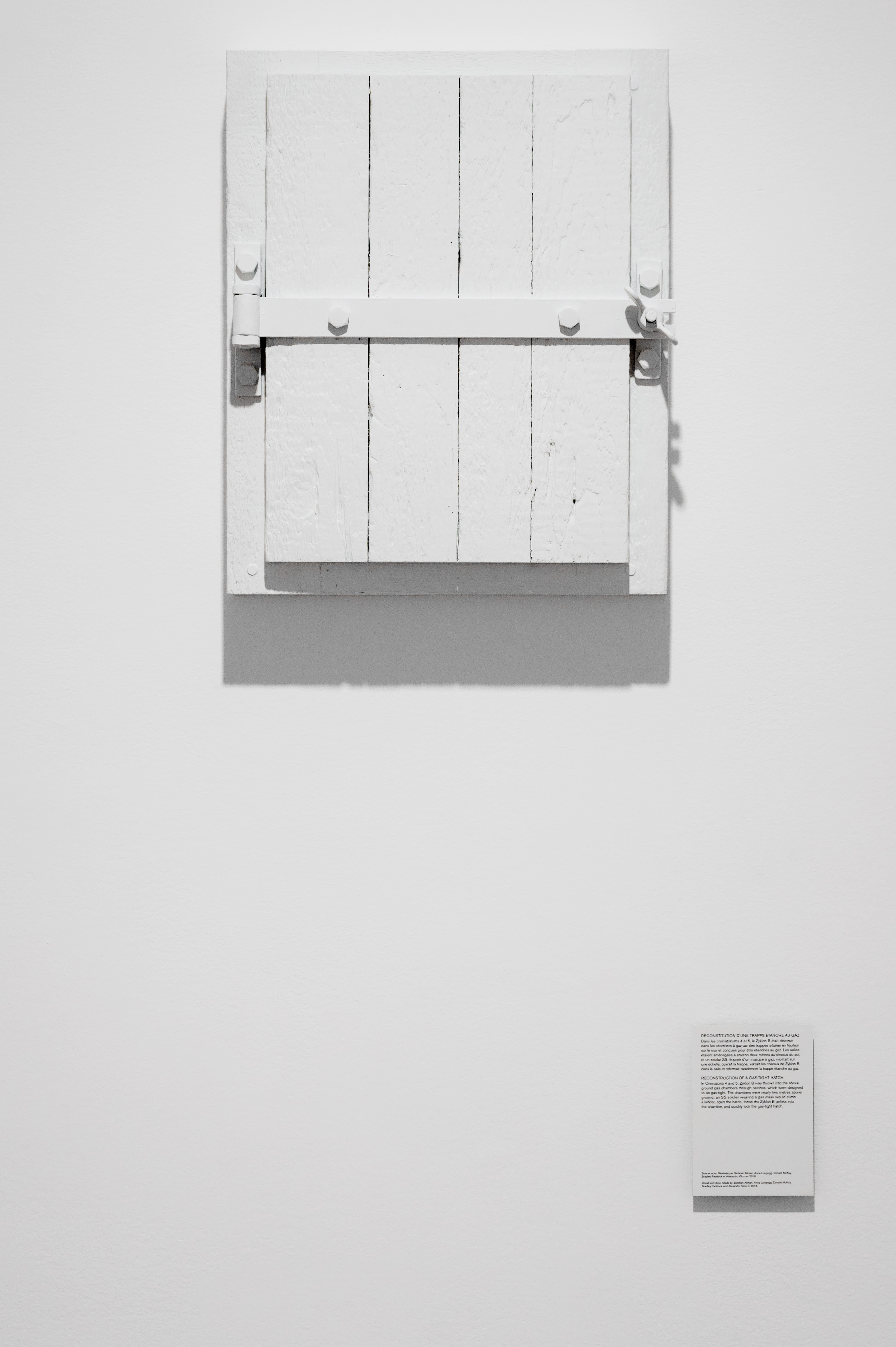 Les documents reproduits sont tirés de la preuve assemblée par Robert Jan van Pelt dans le cadre d’un procès en diffamation tenu à Londres en 2000, dans lequel le demandeur niait l’existence des chambres à gaz d’Auschwitz-Birkenau. Les moulages et les fragments ont été réalisés à l’École d’architecture de l’Université de Waterloo, Ontario, sous la supervision des commissaires de l’exposition.