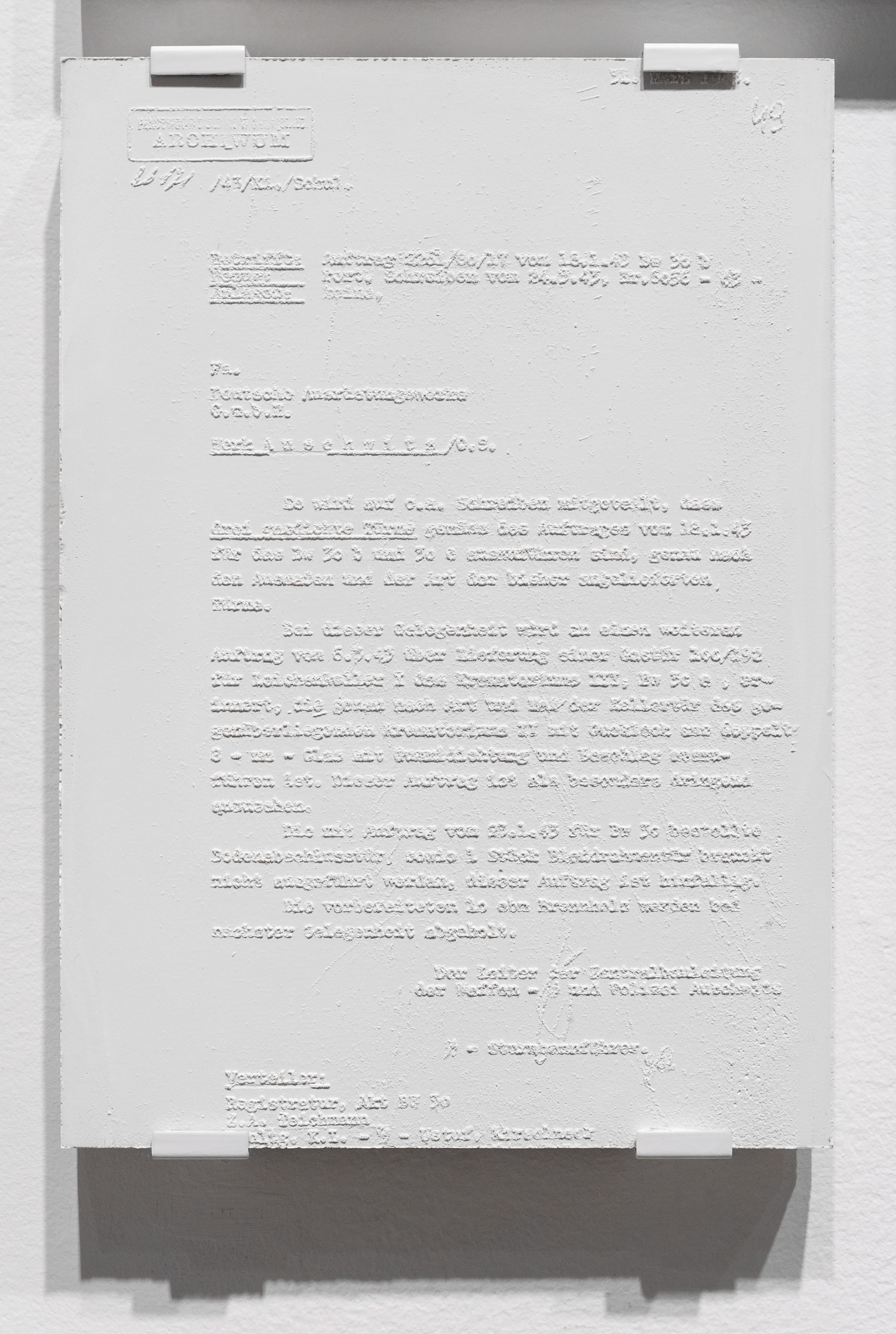 L’installation se présente aux visiteurs comme un paysage blanc, accompagné de très courts textes explicatifs. Entre esthétique de la disparition et camouflage de l’horreur, cette blancheur constitue presque un obstacle. Les moulages ne peuvent être déchiffrés qu’à courte distance et être compris qu’après une inspection comparative minutieuse. Les textes guident l’œil qui cherche et peine à trouver. La tentation de toucher l’objet pour mieux déchiffrer, ou de faire apparaître les images en relief par frottage, est constante. L’effort exigé permet de comprendre la conception du complexe crématoire et les modifications apportées aux accès par les architectes pour accroître la productivité, et de réaliser que les chambres à gaz n’étaient pas munies de fausses douches dans lesquelles le gaz mortel aurait été diffusé par la manipulation d’un robinet.