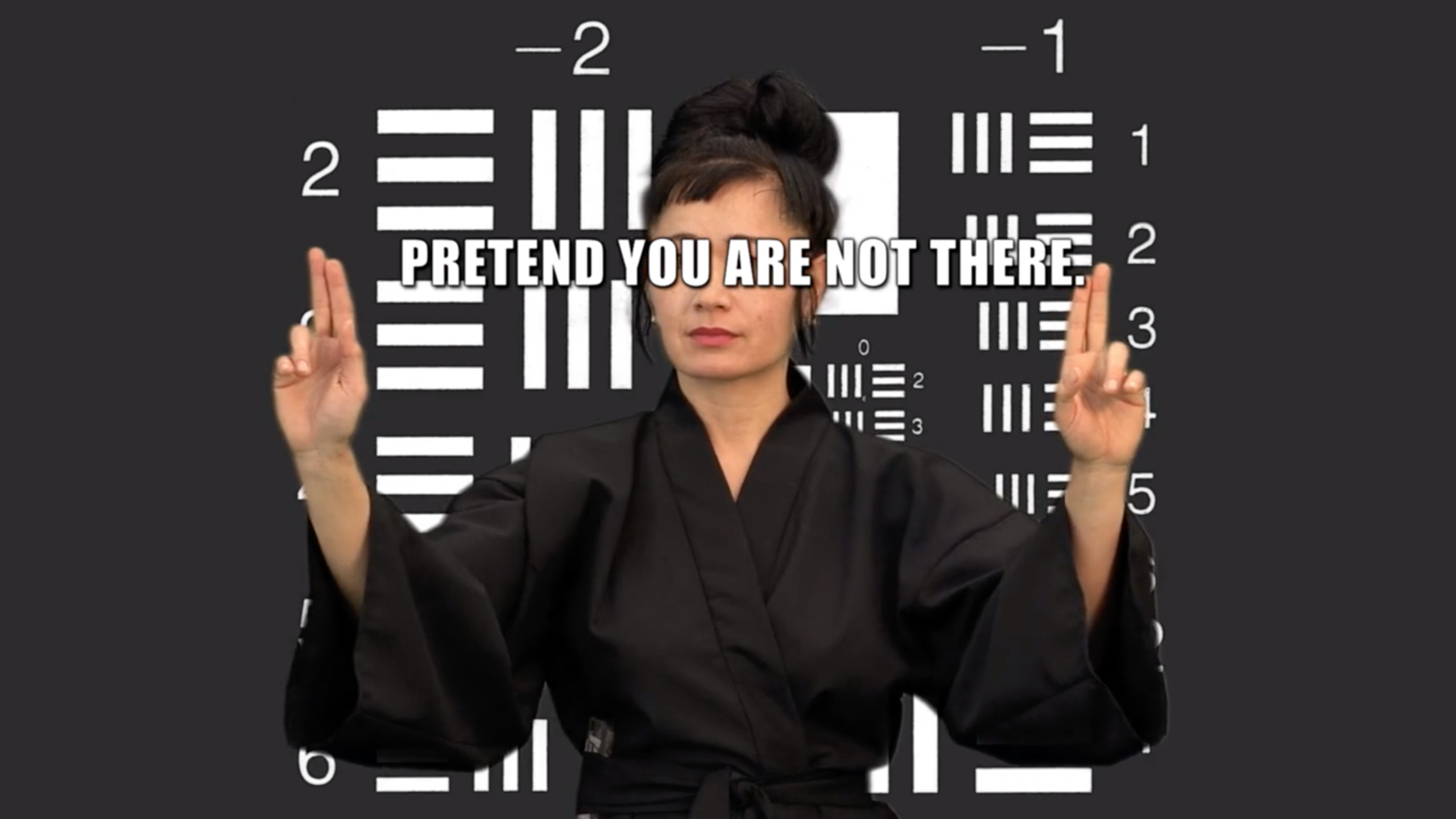 Les objets tels que les mires ont besoin d’avoir un correspondant qui les fasse parler afin d’exposer leur rôle et l’ambigüité de celui-ci au sein de l’histoire du développement photographique. L’exécution de signaux et de mouvements chorégraphiés, similaires à ceux réalisés par les agents de bord des avions lors des démonstrations de sécurité, répond à ce besoin, tandis que les images incrustées grâce aux écrans verts peuvent, pour leur part, être comprises comme des preuves de la porosité de la frontière entre les mondes réel et virtuel. Hito Steyerl agit comme médiatrice entre le monde matériel et un monde immatériel. En tant qu’auteure et protagoniste de ce film, elle est le chef d’orchestre de ces super-objets que sont les mires de calibrage peintes au sol (2 min 22 s). Elle pondère la brutalité du monde réel en proposant de disparaitre, en devenant « image » et en échappant à la reconnaissance d’une individualité.