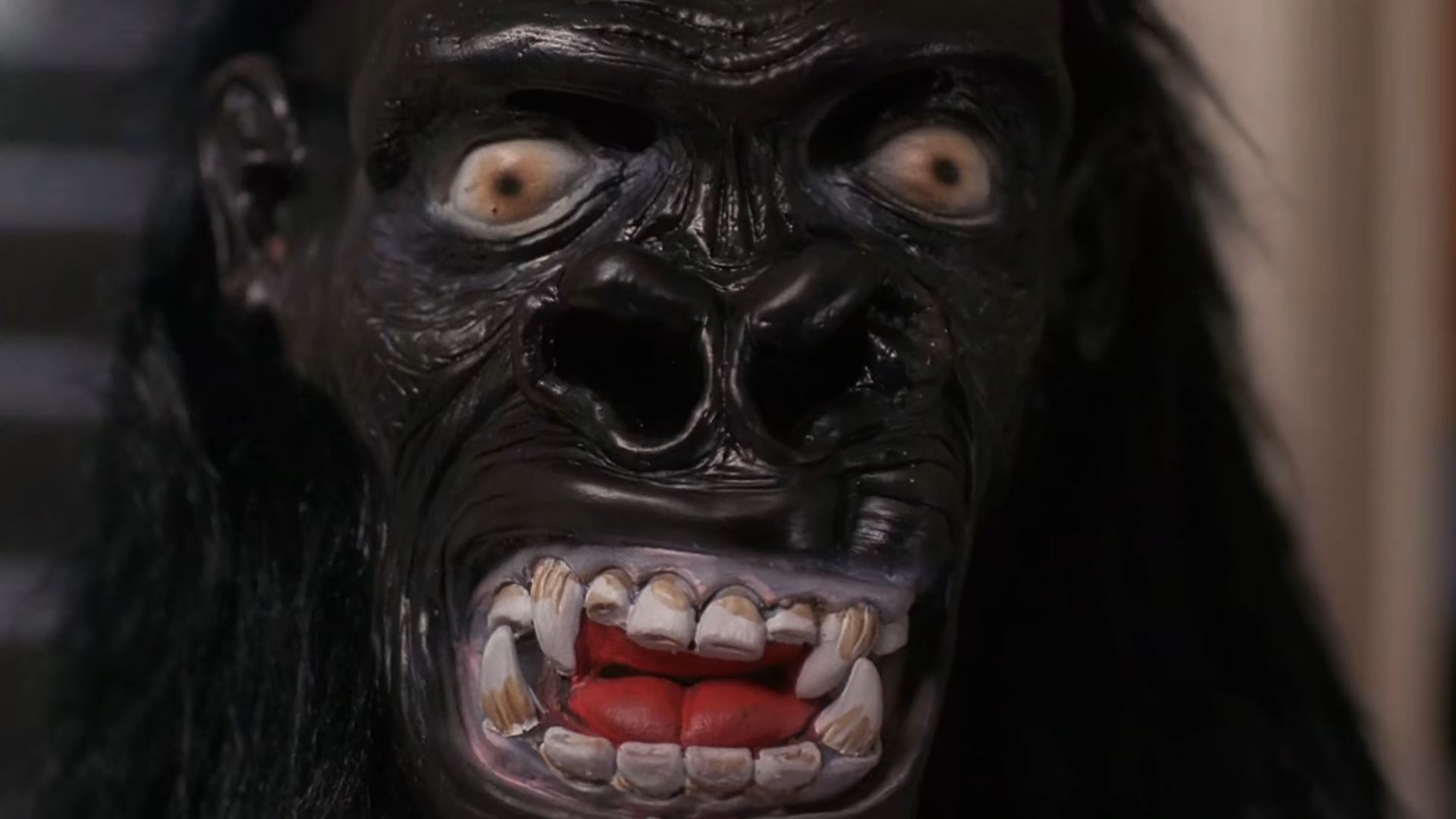 Alors qu’il conduit Mulder, il lui en révèle beaucoup sur le rapport aux croyances et aux savoirs, sur leur statut dans la population locale et dans l’institution, mais aussi sur la forêt. Dans la série, celle-ci est le lieu du monstrueux, de tous les possibles, de l’inconnu. Si on y est attaqué et dévoré, c’est seulement parce que l’on pénètre sur le territoire de créatures qui n’ont plus d’autre refuge possible et qui doivent survivre, comme le montrera la conclusion de cet épisode. Un autre élément qui apparaît clairement dans cet extrait est le rapport à l’animalité et à l’hybridité. L’animalité du monstre a l’avantage, dans la logique du récit, de ne pas l’inscrire dans le paradigme du surnaturel, du démoniaque, de la moralité, mais surtout d’offrir un miroir à l’animalité des humains. Après son échange avec le ranger, Mulder s’éloigne. Le plan coupe et un masque de gorille apparaît en très gros plan. Il se révèle être celui d’un enfant dans une fête d’anniversaire à laquelle Scully assiste à Washington. Puis, on voit un chien mangeant le gâteau d’anniversaire. Scully, expliquant l’incident, parle de « Jungle warfare », et on voit une dizaine d’enfants hors de contrôle, mangeant, se frappant les uns les autres. Elle dira même à la fin de l’épisode, après avoir aperçu la femme sauvage : « I was just thinking about my godson’s birthday party. Eight little six-year-old boys running around. Talk about primitive behavior. » (32 min 22 s)