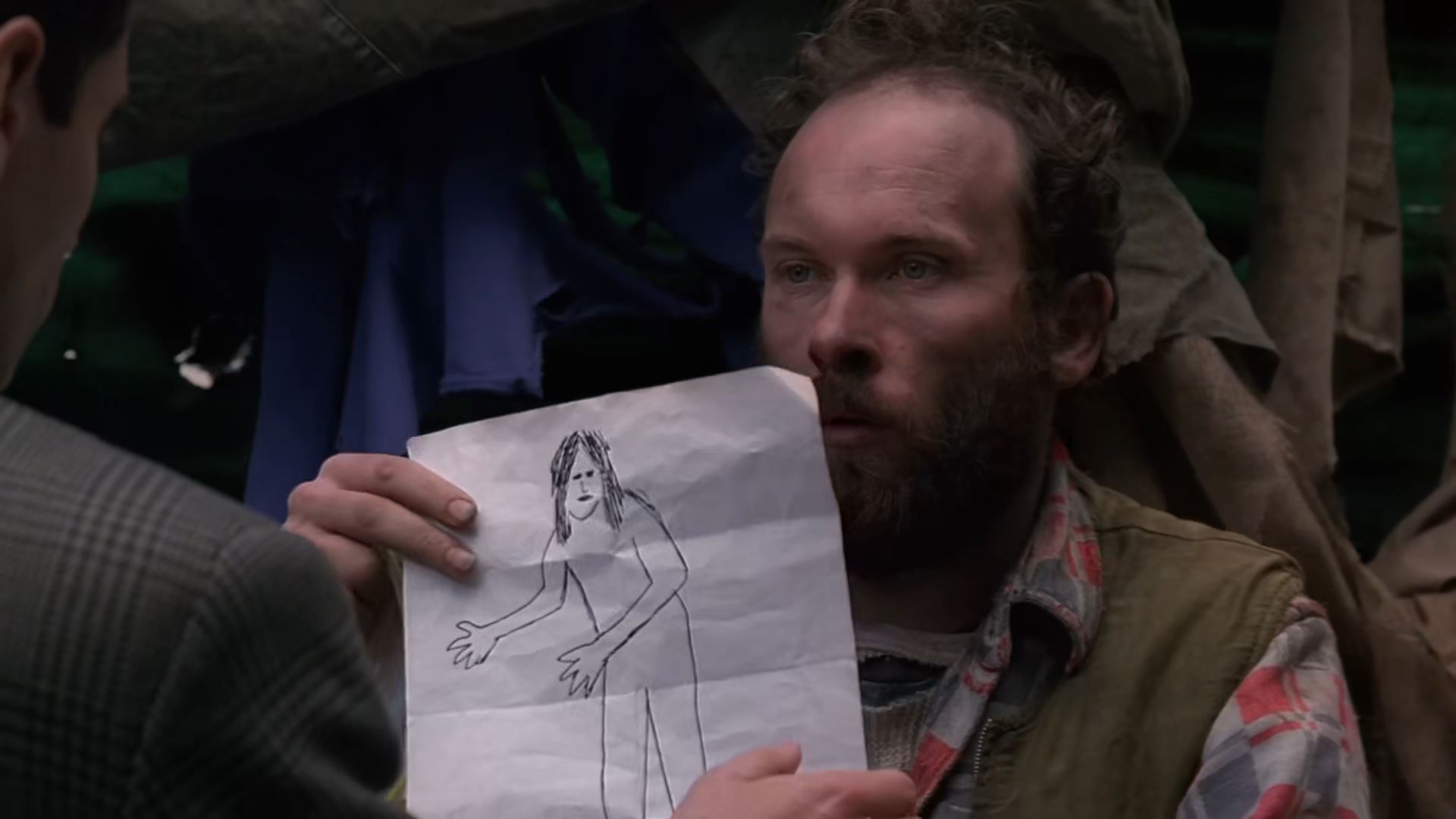 Grâce au savoir du groupe de sans-abris, nous avons accès à la première représentation visuelle de la créature — un dessin très approximatif évoquant le Bigfoot — accompagnée de témoignages. Mulder troque alors avec l’un d’entre eux sa chambre d’hôtel contre un abri dans la rue et, au milieu de la nuit, il aperçoit la créature, qu’il pense plus affamée qu’agressive. Lorsqu’il tente de convaincre Scully de son existence, elle rétorque que ce n’est « nothing more than a sighting in a dark alley » (23 min 10 s). Nous sommes toujours dans les clichés de films d’horreur et dans les témoignages douteux. Scully décide alors de consulter son ancien professeur d’anthropologie à l’université locale. Le savoir académique, incarné par une figure de professeur — d’ailleurs interrogé dans son bureau —, a souvent un rôle important dans les épisodes où différents régimes cognitifs entrent en compétition. Nommons ce type de personnage le « spécialiste », par opposition au « guide local ». Ici, le professeur d’anthropologie offre une perspective comparatiste, mais aussi une explication fondée sur le déterminisme biologique et sur l’évolution des espèces. Parlant du mythe de l’homme sauvage, il explique :