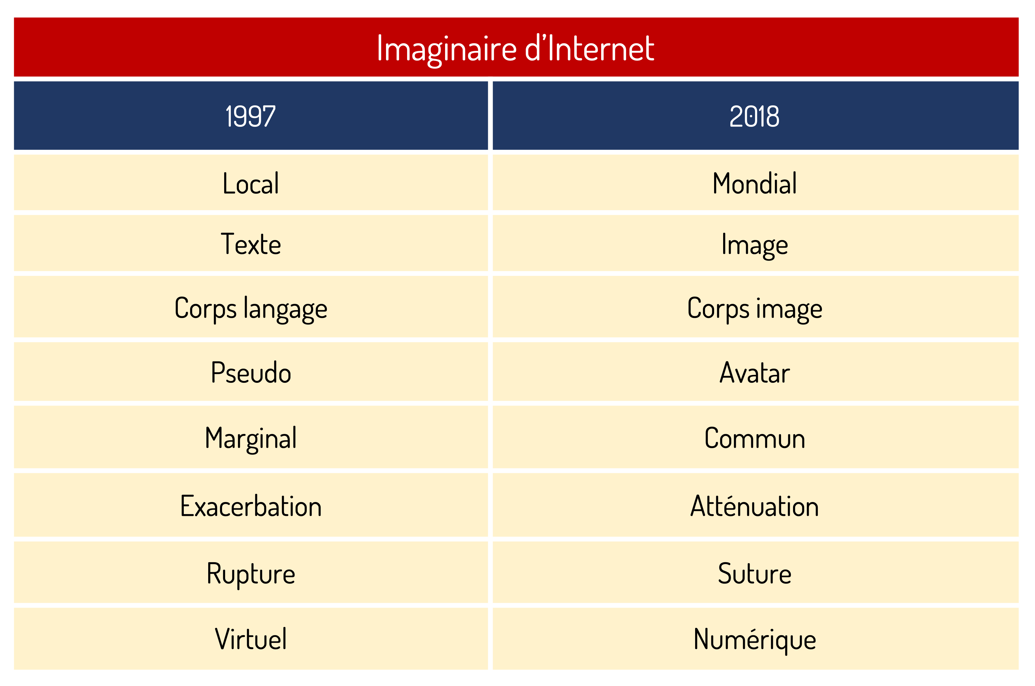 Le tableau ci-contre vient synthétiser l’écart entre les conceptions d’Internet qui s’affrontent dans les deux romans. Il permet notamment de distinguer le virtuel, terme peu à peu devenu désuet, et le numérique, terme actuellement accepté. Ces valeurs antithétiques seront présentes tout au long de notre lecture croisée.