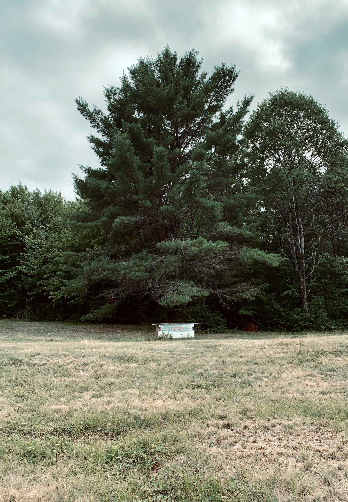 Lors de l’une de ses sorties d’exploration du pays bucolique qui entoure sa résidence de repos, Justin s’arrête par hasard dans une « auberge de grand genre » (39) guère fréquentée hors saison et sise au pied d’une petite éminence qu’il décide de parcourir avant de déjeuner. Il monte « depuis une heure » (41) sur une « route neuve » de « goudron luisant, noir » (40), dont on peut supposer qu’il s’agit en fait de bitume, matériau fabriqué notamment à partir de pétrole et qui supplante ce dérivé du charbon depuis les années 1950 en Europe. Progressant au gré des écriteaux annonçant un mystérieux « Camping du Cheval Mort », il tombe sur un petit kiosque à la forme ancienne mais au matériau récent :