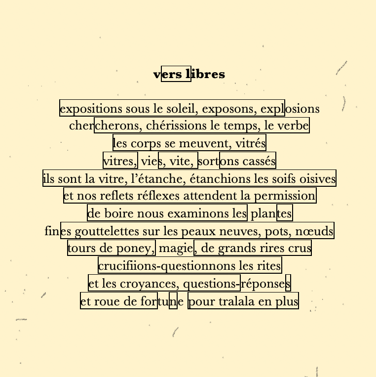 Ce regret agit aussi dans les temps de verbes. L’accumulation excessive de verbes dont les temps sont incompatibles crée une panique, un empilement, un jeu de dominos s’effondrant dans tous les sens, passé-présent-futur : « exposons », « explosions », « chercherons », « chérissions », « se meuvent », « sortons », « étanchions », « attendent », « examinons », « crucifiions-questionnons ». Nous lisons une incertitude, une parole à la croisée, qui hésite : doit-on revenir en arrière, revenir sur ses actions, doit-on aller de l’avant, penser au-delà, ou se questionner maintenant, prendre acte, se responsabiliser, au présent. Et j’écris ses actions, mais elles ne sont pas individuelles. C’est d’un corps collectif qu’il s’agit; le nous est partout, malgré son absence.