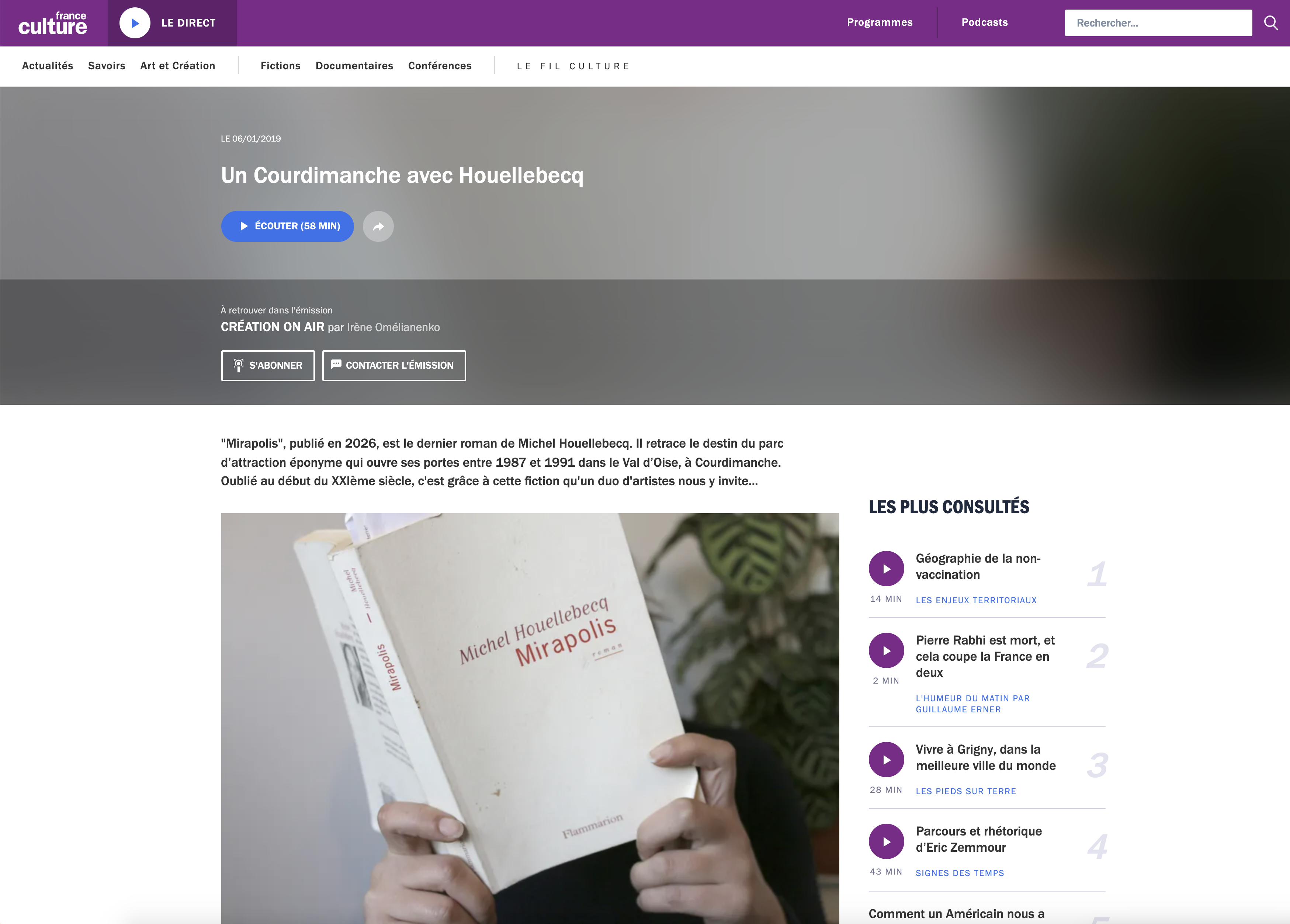 Les titres des œuvres composant le diptyque annoncent la couleur d’emblée. « Un Courdimanche avec Houellebecq » fait référence à la commune éponyme, située dans le Val-d’Oise, et de façon sous-jacente au jour de diffusion et au format concis de l’émission radiophonique. Il s’agit d’un faux reportage radiophonique pour lequel Juliette Tison, journaliste, rencontre Philippe Faguol, un universitaire spécialiste de Houellebecq, qui est également « entrepreneur » (Derzypolski et Lescanne, 2019: 2 min) : il a fondé une maison-musée consacrée à l’écrivain. Le montage de l’émission fait s’alterner l’entretien mené lors d’une visite immersive de la maison-musée et la lecture du dernier ouvrage de l’écrivain, Mirapolis, qui porte sur le parc d’attractions du même nom. L’émission associe ainsi deux lieux de patrimonialisation et d’exposition de la littérature que tout paraît a priori opposer, l’un étant un lieu de mémoire, l’autre un lieu de divertissement. La forme du reportage radiophonique décline celle du reportage de presse in situ, dont l’essor a accompagné, au XIXe siècle, la consécration des demeures d’écrivains dans l’espace public (Emery, 2016 [2012]).