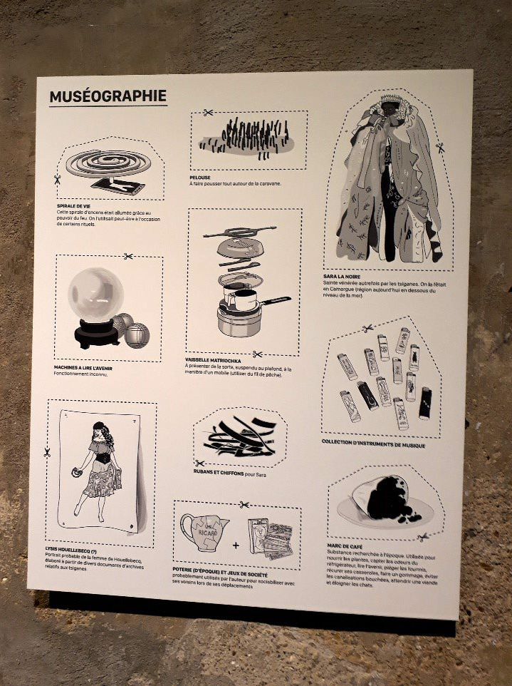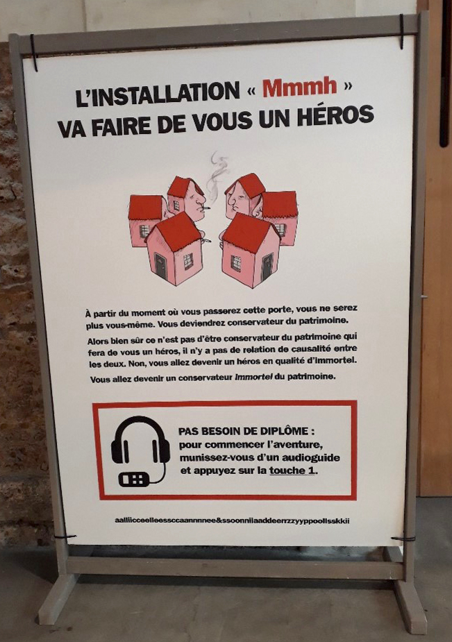 - 7. L’exposition se constitue d’une table d’orientation, d’une maquette de maison, de couvertures de journaux et de panneaux, le tout réparti en cinq sections. Un premier panneau présente les façades du musée Mmmh, son « escapegame », d’autres panneaux évoquent les étapes d’un parcours (« Portraits du grand homme », « L’écrivain au travail », « La mort de l’écrivain »), d’autres, thématisés, jouent sur l’énigme ou l’engagement (« Qui a tué Michel Houellebecq? Vous enfuiriez vous de cette secte? », « Sauvez le président Ben Abbes », « Luttes LGBT »). Le visiteur prend un audioguide à l’entrée, il devient le conservateur du musée Mmmh et les pistes sonores lui proposent des choix qui orientent son parcours et le devenir de ce musée.