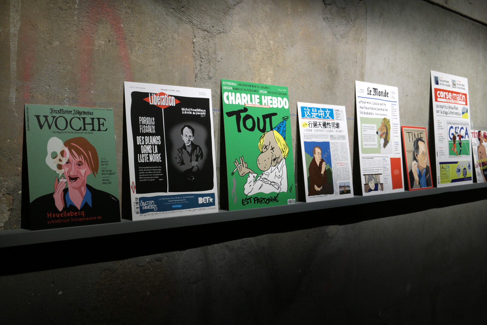 En nous appuyant sur un entretien audiovisuel conduit avec les deux artistes (Régnier et Roussel-Gillet, 2020) et sur un corpus de photographies et d’extraits tirés des deux projets, nous posons la question suivante : comment, à partir d’archives fictives, de faits réels sur un écrivain vivant et de l’esprit de ses romans, ces créations construisent-elles une forme de patrimonialisation déplaçant (tout en la faisant jouer) la force polémique de Michel Houellebecq vers la question — posée par l’auteur lui-même dans son œuvre — de la (dé)hiérarchisation3 des niveaux d’autorité qui structurent les milieux littéraire et culturel? Nous analyserons l’hybridation des codes médiatiques (presse, caricature) surexploités dans un parcours muséographique graphique et audio, et le recours au pastiche de modes discursifs propres aux émissions radiophoniques sur le patrimoine littéraire matériel. Dans ce jeu de poupées gigognes impliquant médias et registres de discours, que comprend le visiteur ou l’auditeur de l’univers de Houellebecq? L’hybridation de la littérature et des arts plastiques par l’auteur lui-même (commissaire de sa propre exposition au Palais de Tokyo4) suppose-t-elle des patrimonialisations novatrices?