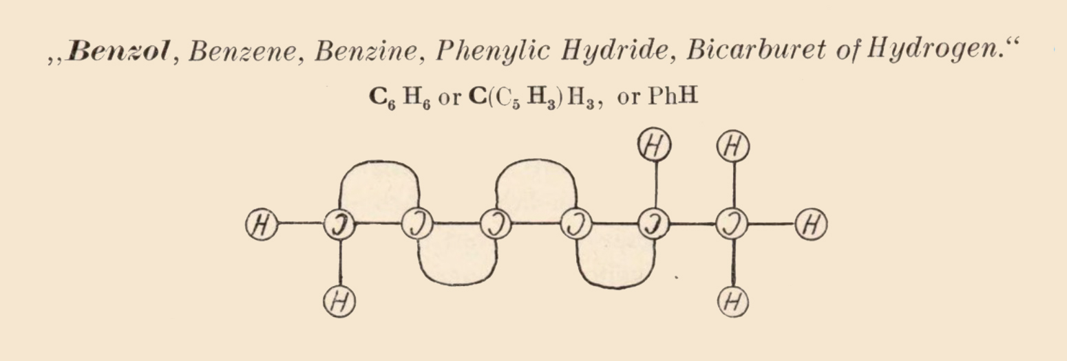 From this “twining and twisting” ouroboros, Kekulé deduced that the structure of benzene was a ring of carbon atoms, although not like any before conceived — not a set circle of bonded atoms, but a round of writhing electrons that oscillated between singly-doubly and doubly-singly bonded poses.