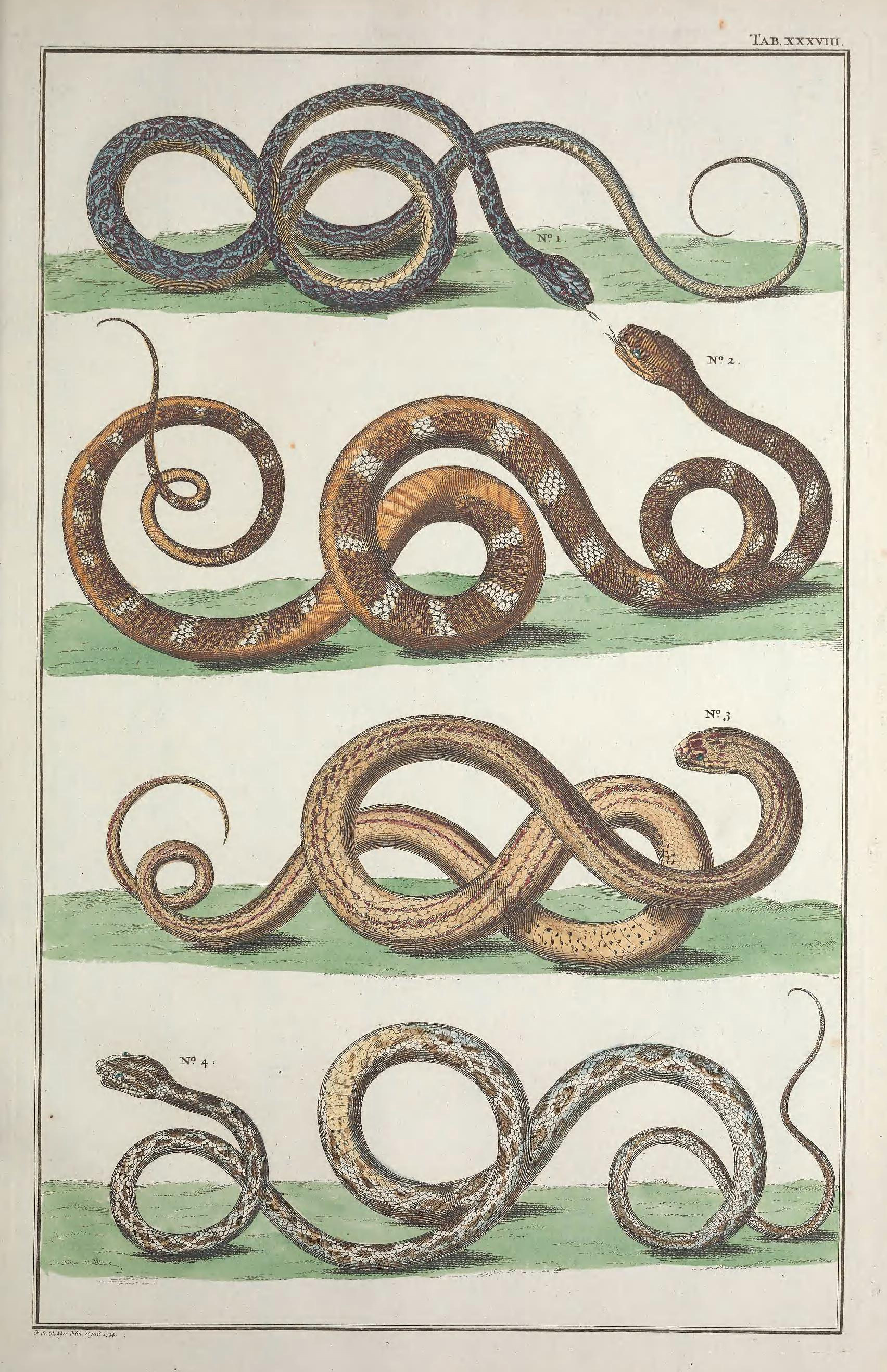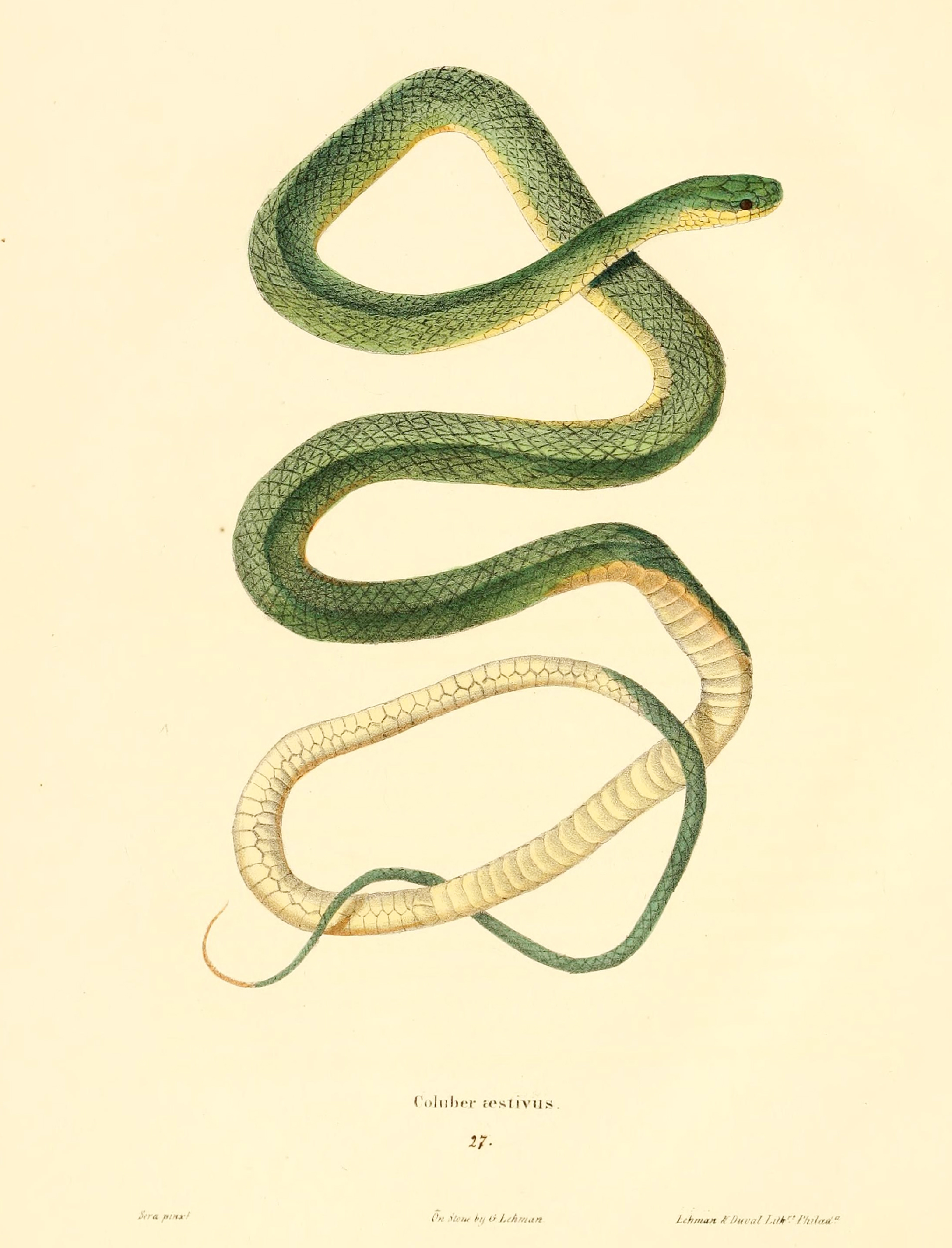 Reflecting on the work of Seba’s Thesaurus, of Sarah Stone, Harriet and Helena Scott, John Edwards Holbrook and many other illustrators of snakes besides, it becomes hard not to wonder how much of their evocative renderings sprang from deep within their own unconscious minds — not in any Freudian sense, but in terms of the encoded visual experiences of primate ancestors passed on and refined over millions of years. A certain irony of portrayal emerges: what makes a snake a “snake” from a human point of view — the sinuous pattern of serpentine curving and coiling — turns out to be the very feature that natural history illustrators have consistently taken the most liberty in depicting. Certainly, artistic interpretation is essential in transforming what was a crumpled, discolored, unfamiliar reptile specimen awkwardly stuffed into a jar into a vibrant and vital creature on a blank page — illustration is a kind of creative alchemy. The claim is not that illustrators completely invented the snake poses, but that they were also drawing from a sequestered, pre-perceptive reservoir of form, giving shape on the page to something inchoate and within. Another way to say this might be that, as far as natural history is concerned, there are no genuine pictures of snakes that aren’t at the same time also somewhat imaginary.