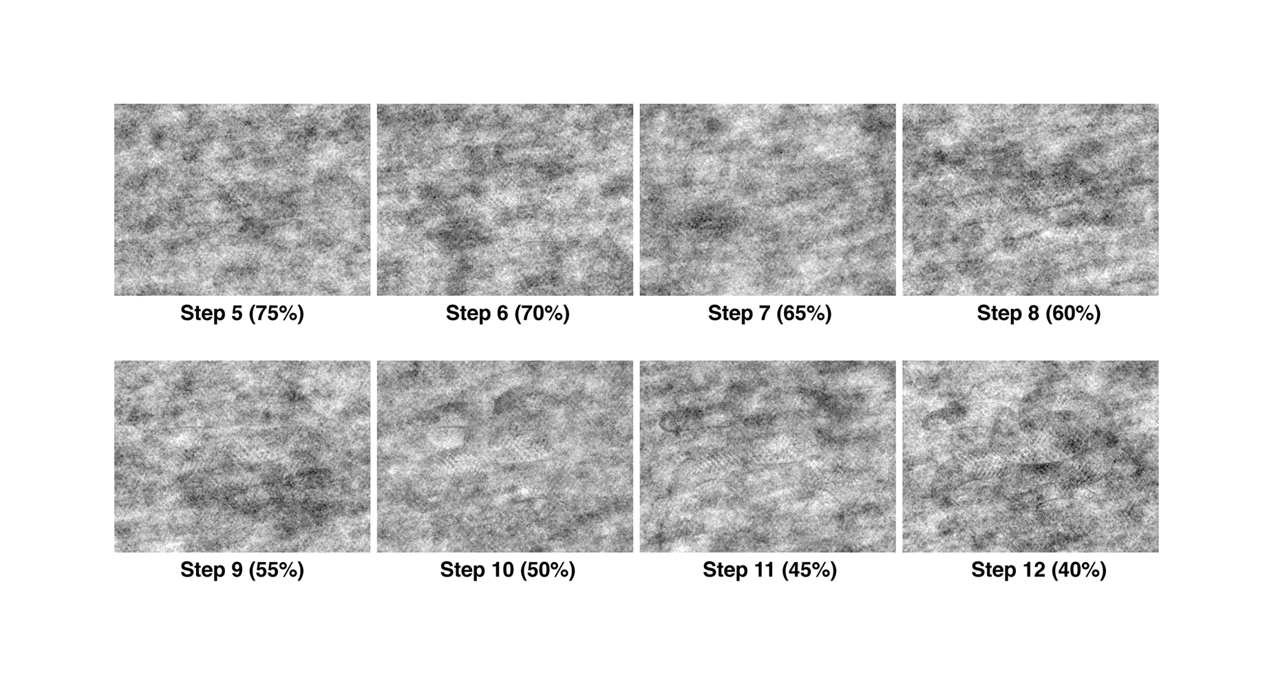 As sweeping as the hypothesis may be, it is also quite testable. Its key prediction is that humans should have a special and innate predilection for visually recognizing snakes, and a plethora of scientific studies appear to bear this out. Not only do human infants and adults visually detect snakes more quickly and accurately than other organisms6, they also spot the proverbial snake in the grass inordinately well: camouflaged images of snakes recognized more readily and with greater accuracy than identically obscured pictures of other familiar animals like cats, birds, or fish (Kawai and He, 2016). This figure shows parts of the 20-step sequence in which snake images were artificially camouflaged by a visual noise algorithm. Most human subjects identified the image as a snake by step 8 (60% obscured), while it took until step 10 or later for images of birds, cats, or fish to be correctly recognized.
