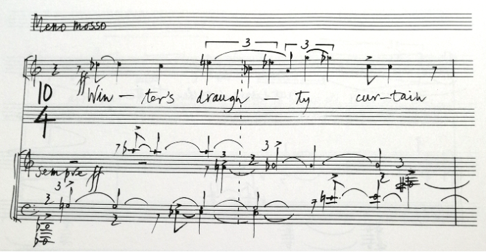 En ce qui concerne le deuxième cycle étudié, composé sur des poèmes de Ratouchinskaïa traduits en anglais, le titre ne fait guère référence au chant mais bien à la poésie : Three Poems of Irina Ratushinskaya. Le poème mis en musique reste poème et n’en devient pas pour autant chanson. Tout porte à croire que le statut de la parole dans ce cycle, basé sur le recueil No, I’m Not Afraid (1986), s’apparente davantage au régime poétique, à celui de la déclamation et de la vocalité orale et parlée. En invoquant, dans la dédicace, une ambition universelle — « To all imprisoned unjustly » (McLeod, 1991: n.p.) —, le cycle se présente comme un geste engagé et quasi politique : réaction protestataire à un régime totalitaire et écrit testimonial.