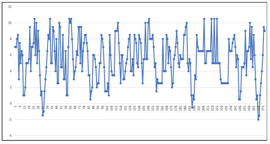Les données obtenues dans l’étude intervallique de la courbe mélodique permettent de se pencher sur les graphiques individuels, de les comparer et d’observer l’évolution de chaque morceau dans sa globalité9, comme dans cette représentation de l’évolution mélodique globale dans « I Will Travel Through the Land ».